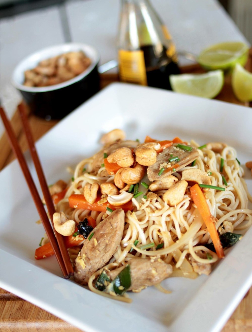6. Tillsätt fasanköttet och marinaden, fortsätt röra om under hög värme tills marinaden reducerat ner till hälften. Häll ner nudlarna i pannan och blanda runt ordentligt i några minuter. Smaka av med soja eller salt och toppa med färska örter chashewnötter och några limeklyftor.