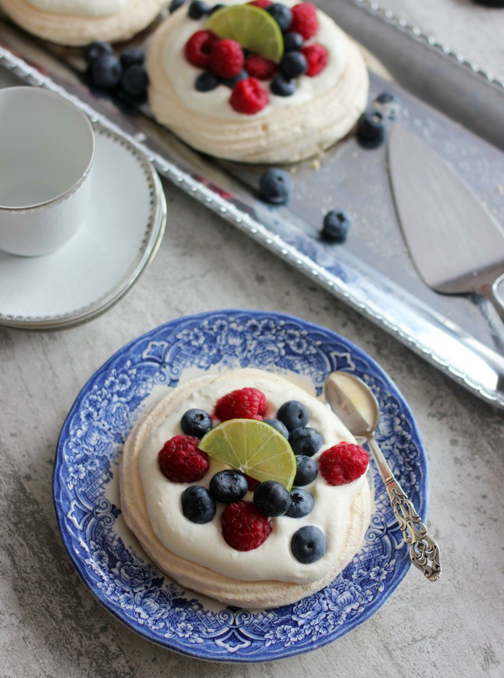 4.Fördela blåbärscurden i pavlovorna och bred på en klick grädde och toppa med färska bär och eventuellt en skiva lime.