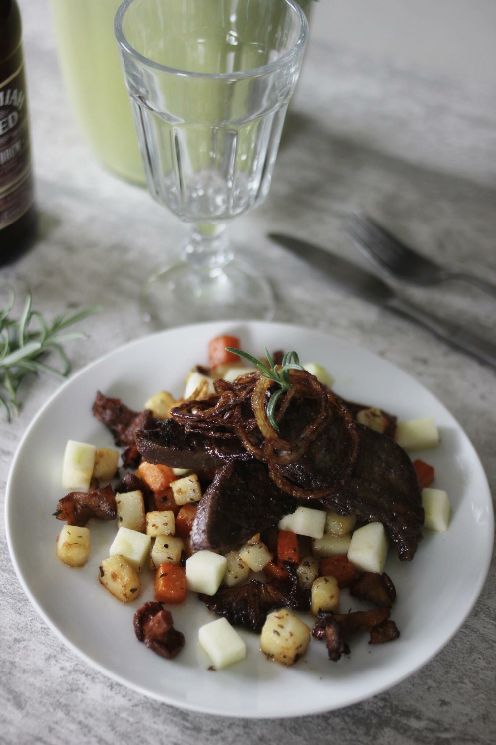 5. Tärna äpplena och blanda med rotfruktern, servera med levern och skirat smör.