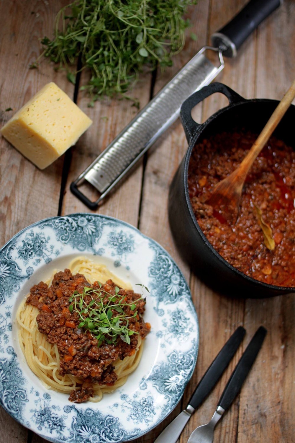 3. Smaka av grytan med salt och peppar. Servera med sphagettin och toppa med nyriven västerbottenost eller annan lagrad ost.