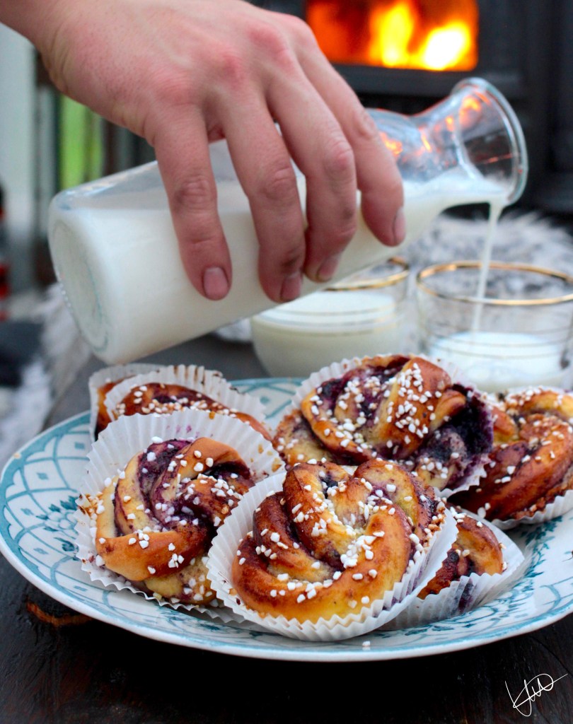 4. Vispa upp ägget och pensla bullarna, toppa med pärlsocker och grädda mitt i ugnen 7-8 min. dom ska vara gyllenbruna och inte degiga. Servera bullarna ljumna med kalla mjölk.