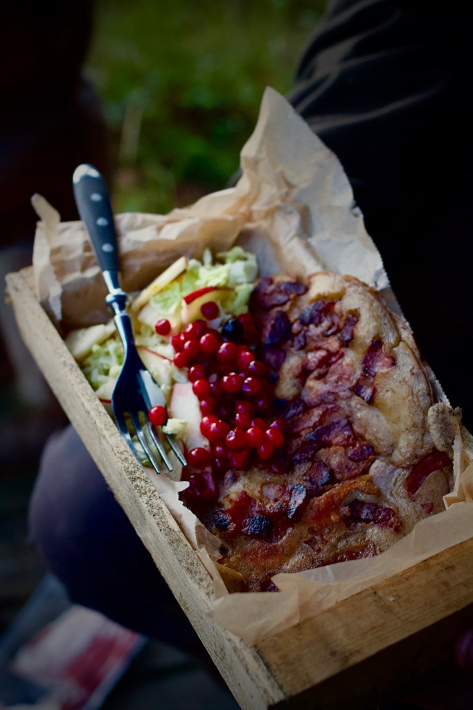 3. I skogen – tänd elden och låt den brinna ner tills du har en bra glödbädd. Ställ stekpannan rakt på kålen och stek 1/4 av fläsket tills det fått fin färg. Tillsätt olja och en klick smör, häll sedan på 1/4 av smeten och stek på varje sida tills den fått fin färg. Servera rykande het med lingonen äpplet och kålen.